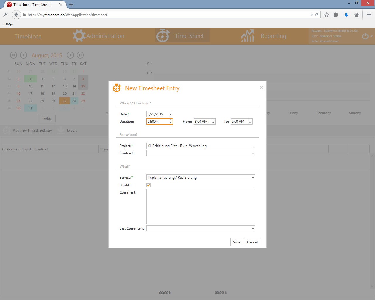As Time-Recorder tagged employees record their Working-Hours due to entering duration, start- and endtime within the Time-Recording-View. Additionally it’s necessary to assign those tracked times to a project as well as a specific order. One can choose the art of accomplishment from a given spectrum and can also define if the work was billable or not. Of course there's also place for an additional note. In the evaluation section, all of the billable hours of an employee will be calculated with the hourly rate. so that it is possible to review the sales of one's employee.